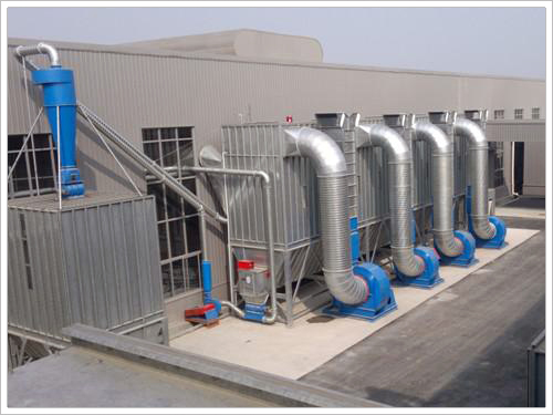 該種型式的玻纖袋式除塵器,其排氣閥、反吹風(fēng)閥均設(shè)于下面排氣管處。含塵氣體在排風(fēng)機(jī)作用下吸入進(jìn)氣總管;通過(guò)各進(jìn)氣支管進(jìn)入進(jìn)氣室;均勻地通過(guò)上花板;然后涌入濾袋,大量粉塵被滯留在濾袋上;部分粉塵直接穿過(guò)下花板落入灰斗,而氣流則透過(guò)濾袋得到凈化,凈化后的氣流通過(guò)排氣閥進(jìn)入引風(fēng)機(jī)排入大氣中。